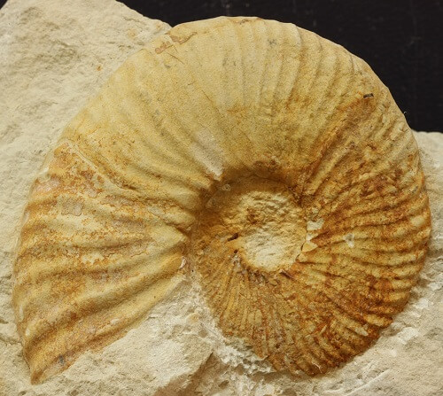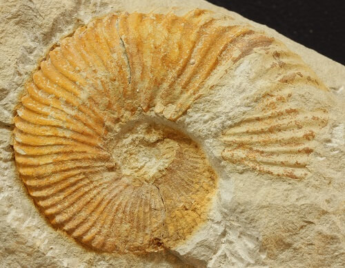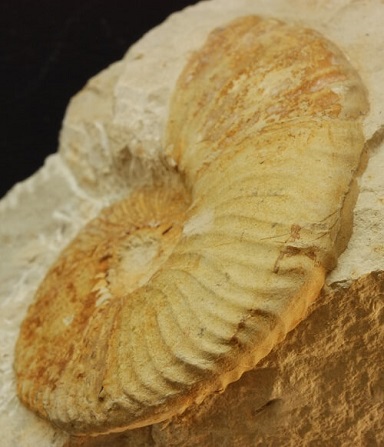 Foto 1 y 2. Primer ejemplar de Neocomites subpachydicranus. A destacar el crecimiento súbito del grosor de la ornamentación al comienzo de la cámara de habitación (parte más clara de la concha). En vista oblicua se observa el paso de las costillas por la zona ventral. Mide 50 mm de diámetro.